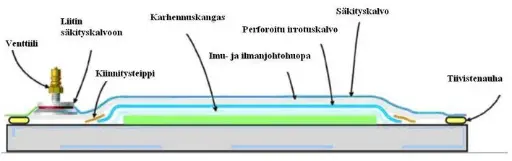 Jos karhennuskangasta käytetään, se laitetaan seuraavaksi laminaatin päälle. Tämän jälkeen asetetaan irrotuskalvo ja imuhuopa.