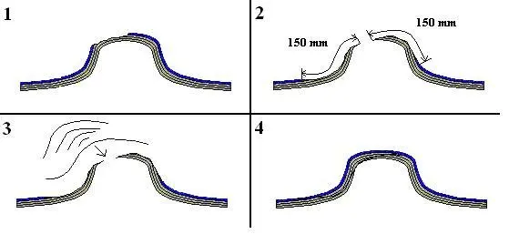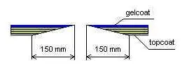 Korjauslaminointi tehdään, jos mahdollista, sisäpuolelle (= epätasainen, karkea, ei sileä muottipinta). Työ aloitetaan karhentamalla vaurioalue noin 15 cm yli joka suuntaan. Hiomapaperin karkeus No 40 – 60. Hionta viistetään syvemmälle vaurion kohdalla ja sen vieressä ja ohennetaan kohti tervettä laminaattia. Jos käytät hiontatyössä konetta, tee lopuksi käsin vielä selviä naarmuja pintaan saadaksesi aikaan vieläkin karheampi tartuntapinta. Lujitemuovilaminaatin korjauskohdan tulee olla riittävän leveä kartio, jotta siinä on tartuntapintaa isolla alalla.